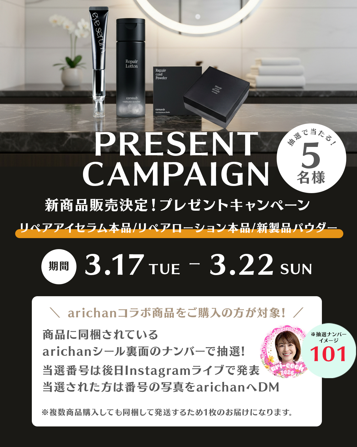 対象のarichanコラボ商品をご購入いただいた方の中から、抽選で5名様に豪華プレゼントをお届けいたします✨