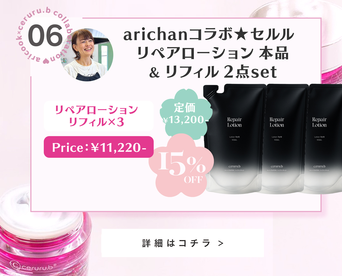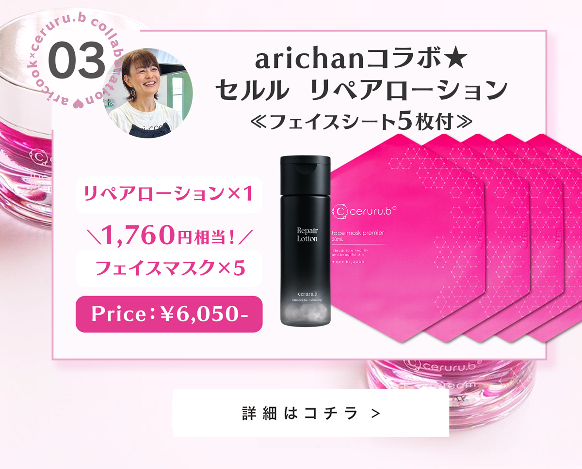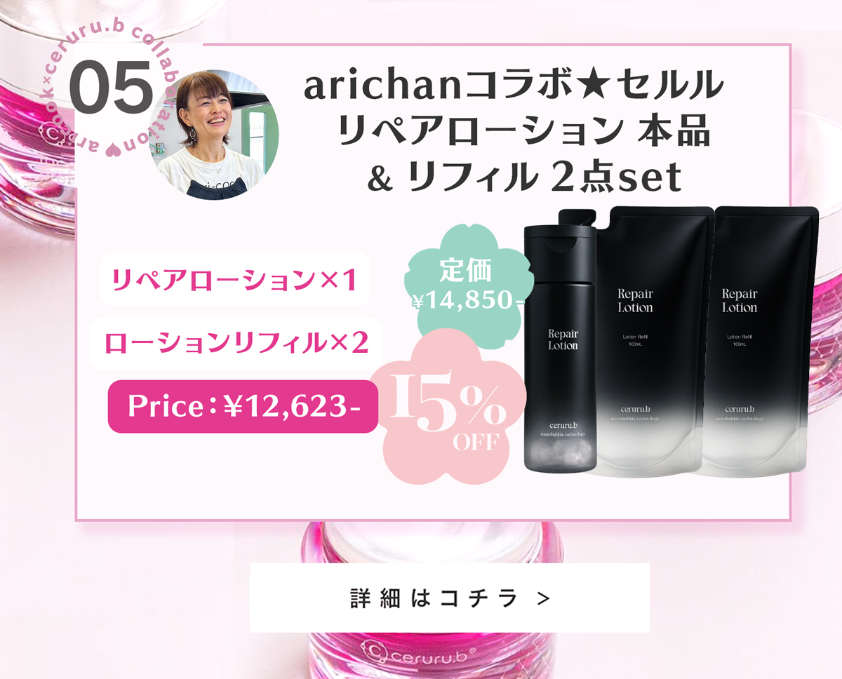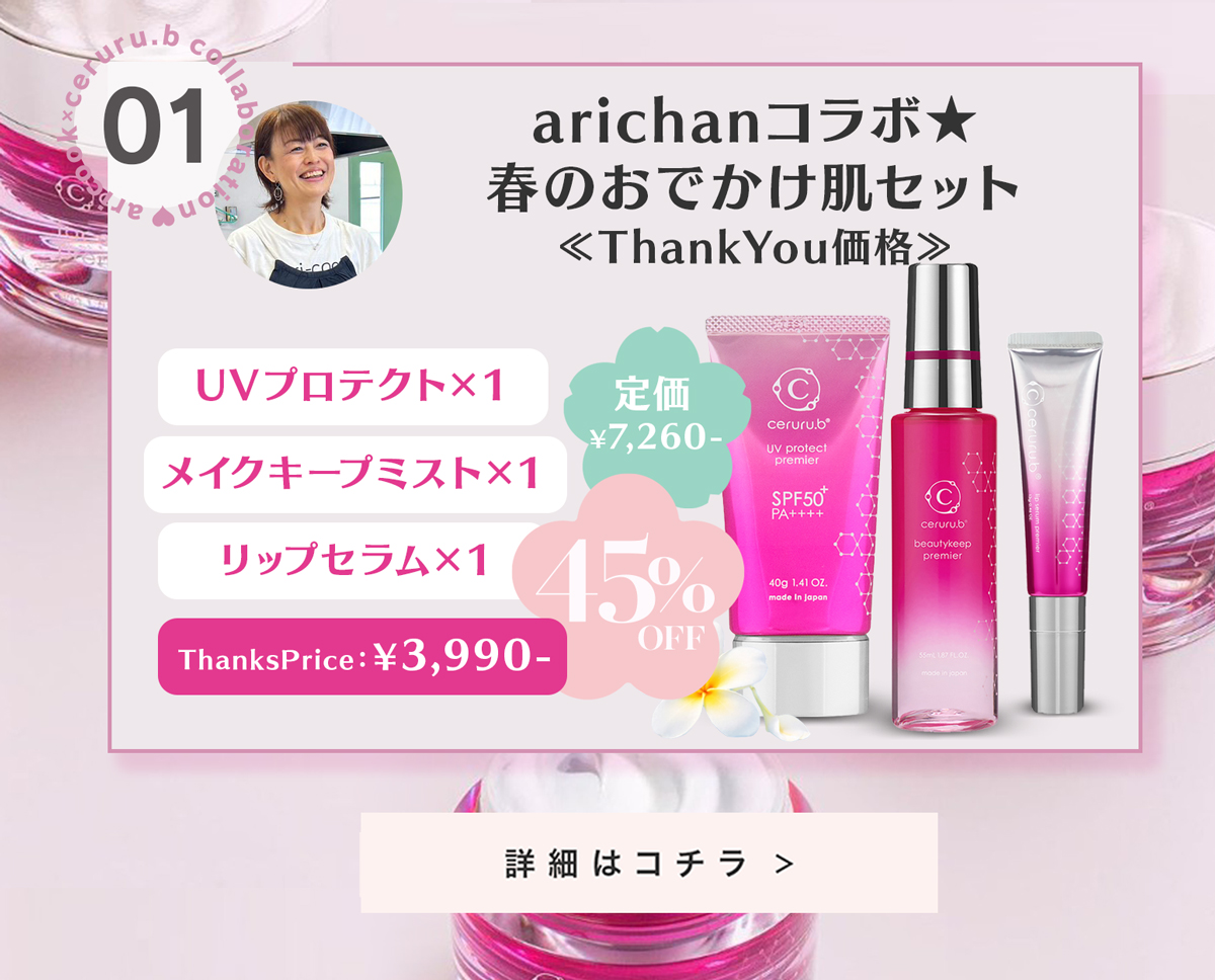大好評のceruru.b×arichanコラボスキンケアセット!2026年春、ついに第5弾の販売がスタート✨今回は、春のおでかけにぴったりなUV・リップ・メイクキープが揃った限定セットに加え、人気のリペアシリーズもお得にお求めいただける特別ラインナップをご用意しました🌸