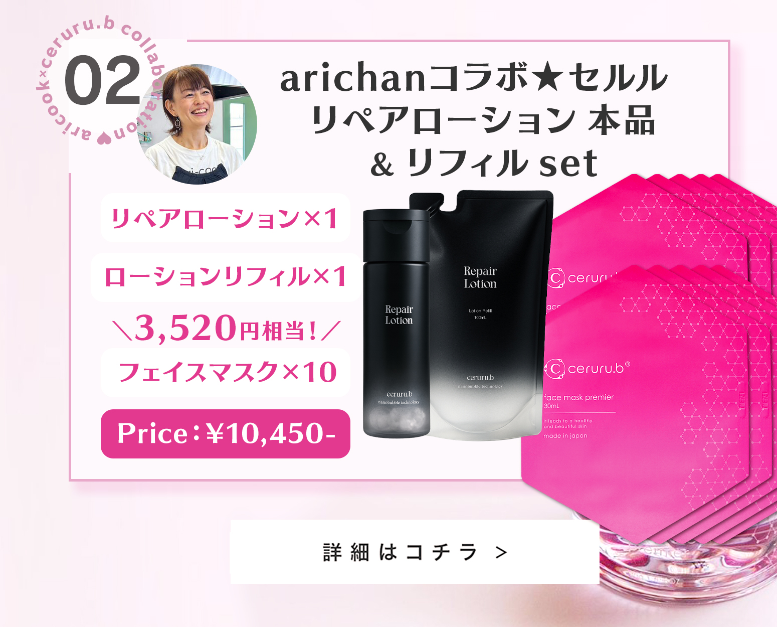人気のリペアローションをたっぷり使える、本品&リフィルにフェイスマスク10枚付きの限定セット♪