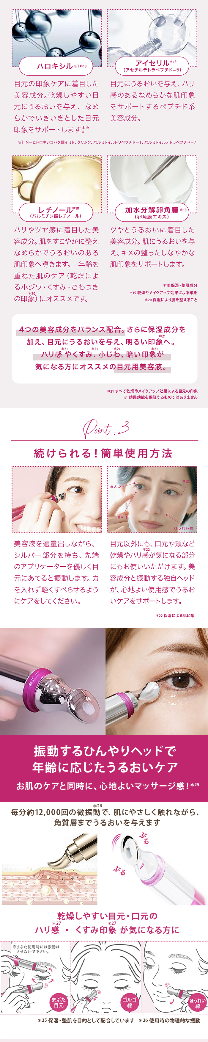 振動ヘッド×保湿設計×ひんやりとした使用感を組み合わせた目元用美容液です。