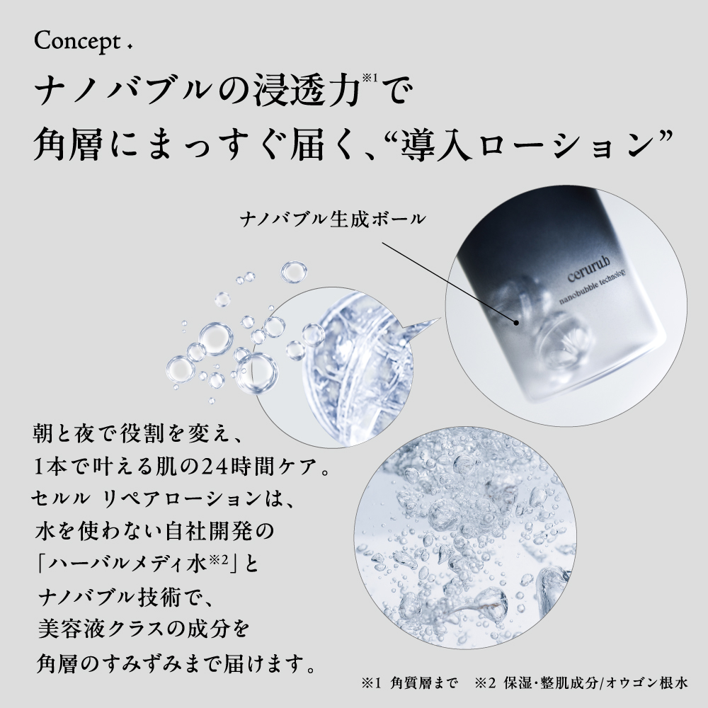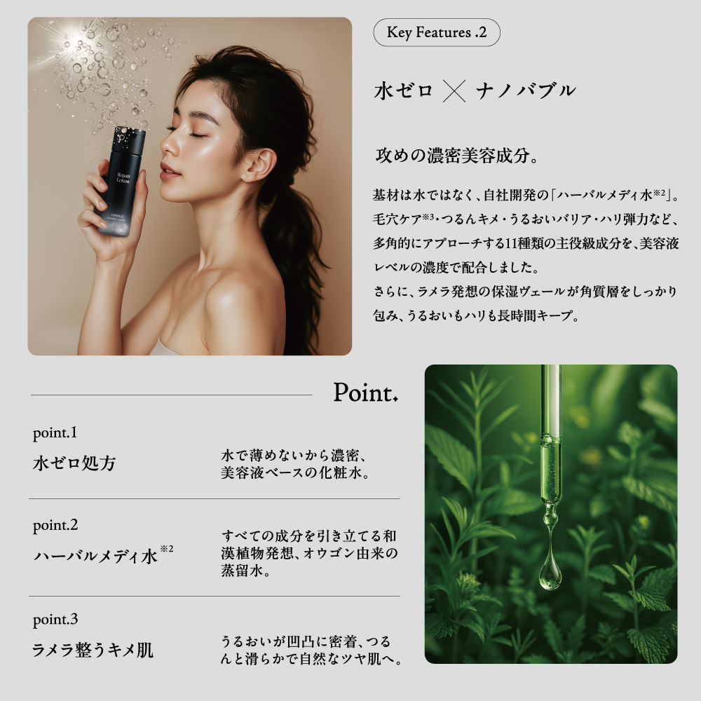 | 商品特長 | ナノバブル発生させる水ゼロ処方美容成分100%の浸透ブースター化粧水 |