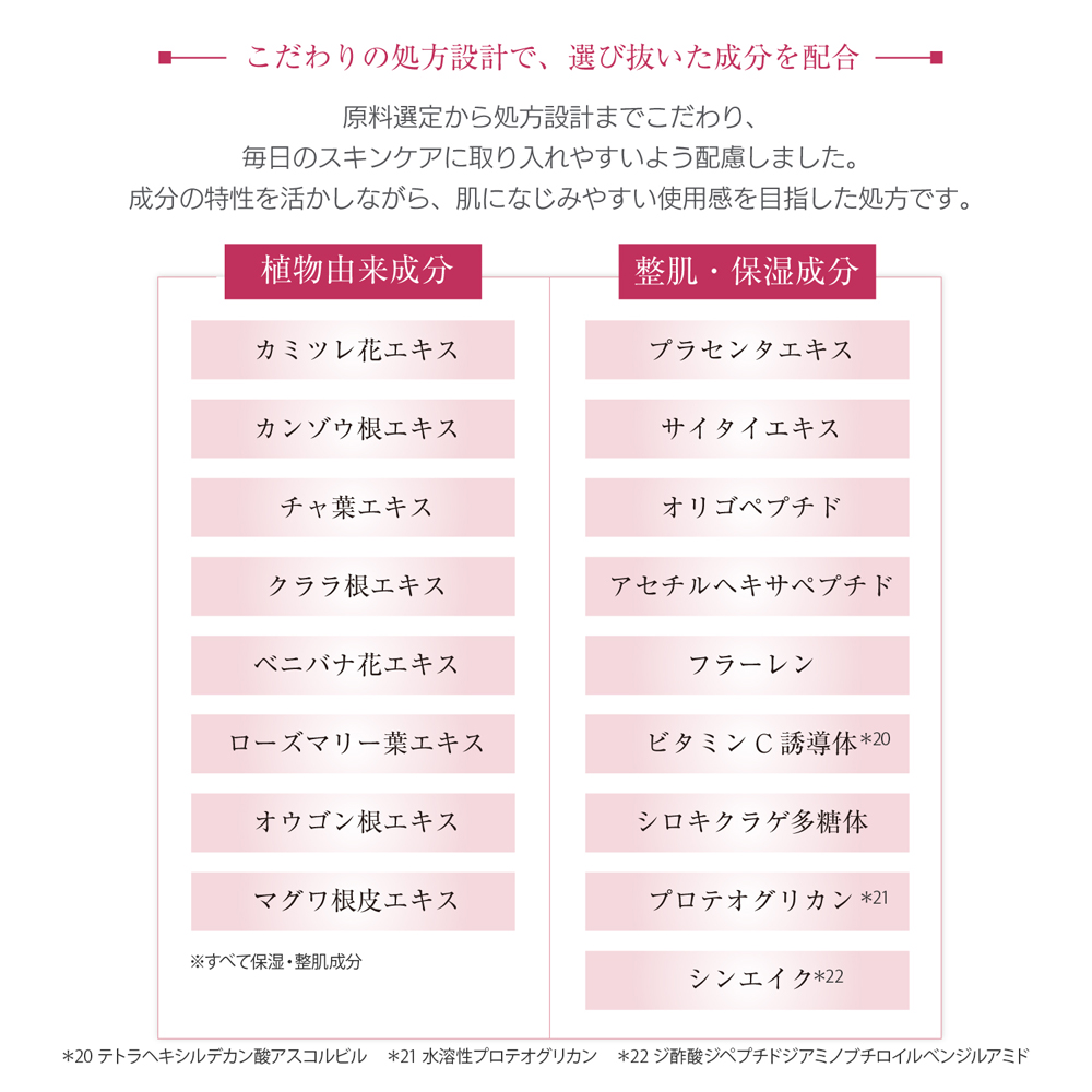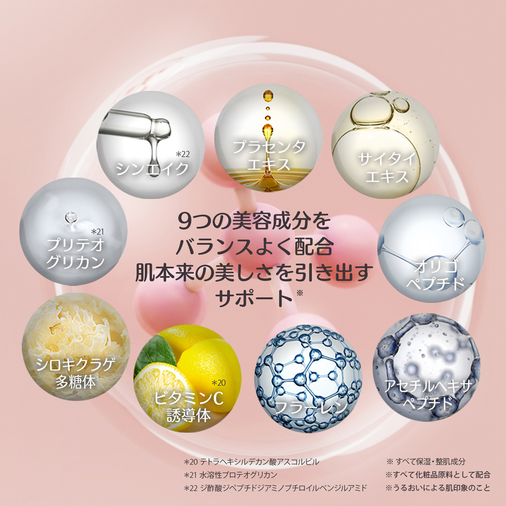 プラセンタエキス※2、サイタイエキス※2、フラーレン※3、シロキクラゲ多糖体※2などの美容成分に加え、9種の植物由来エキス(リンゴ果実培養細胞エキス、カミツレ花エキス、カンゾウ根皮エキス、チャ葉エキス、クララ根エキス、ベニバナ花エキス、ローズマリー葉エキス、オウゴン根エキス、マグワ根皮エキス/いずれも保湿・整肌成分)を配合。 うるおいを与え、乾燥や外的刺激により乱れがちな肌印象をすこやかに整えます※1。