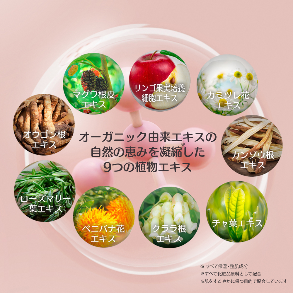 ※1 うるおいにより肌を整え、ハリ感・なめらかさ・明るい印象を与えることオーガニックエキスの恵みを厳選