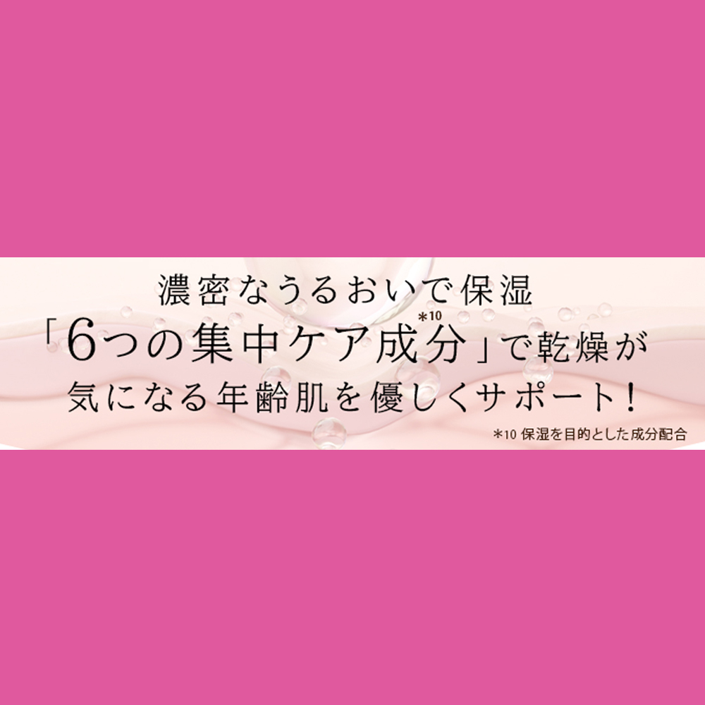 ・濃密なうるおい感:保湿成分配合により、乾燥を防ぎます。 ・なめらかな肌印象へ:角質層にうるおいを与え、キメの整った肌印象へ。 ・ハリ不足が気になる方に:乾燥から肌を守り、うるおいのある印象へ。 ・敏感肌・乾燥肌にも配慮:うるおいを保ちながら肌をすこやかに保ちます。※8。