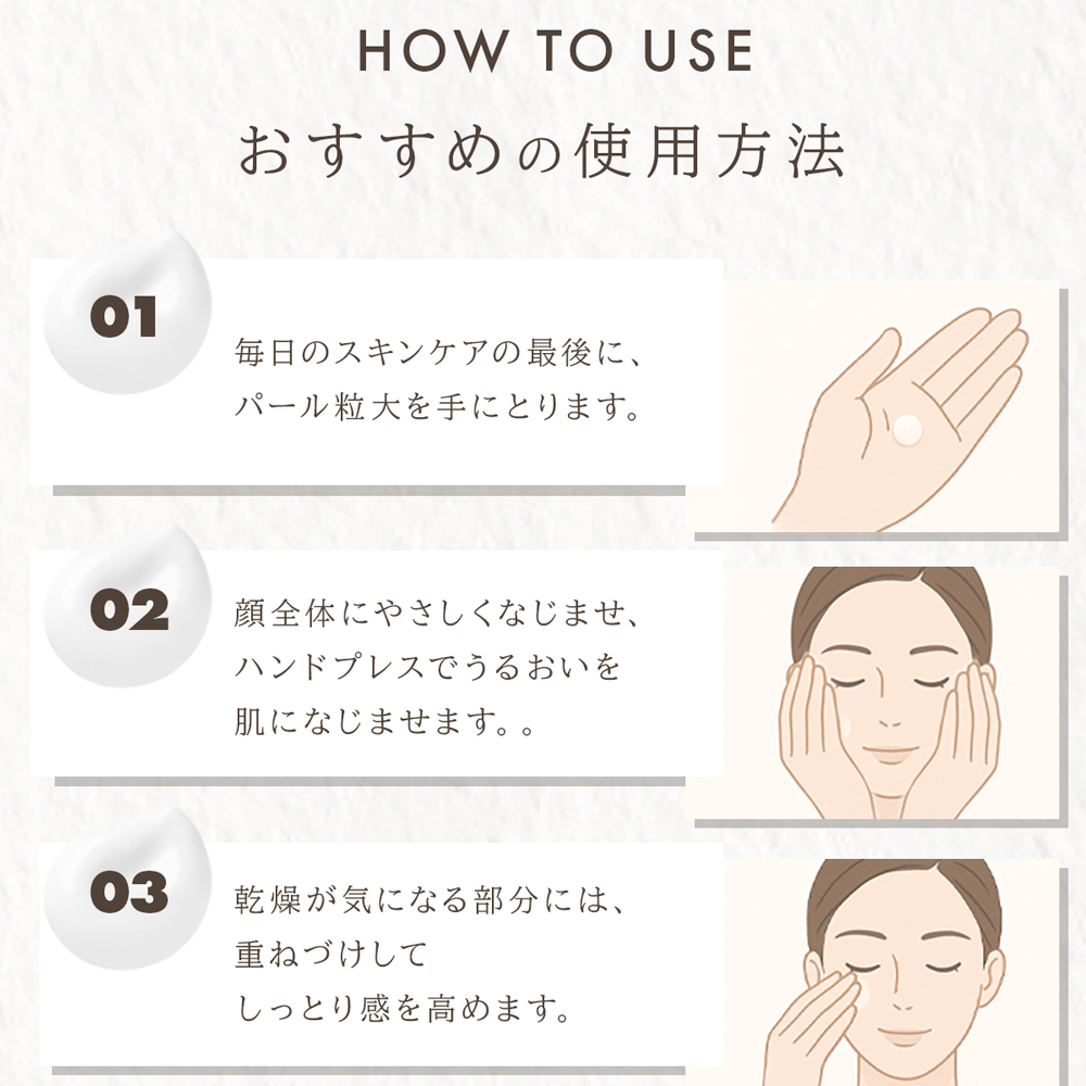 化粧水や美容液でお肌を整えた後、 適量(パール大1個分)を手に取り、顔全体になじませてください。 朝晩のお手入れの最後にお使いください。 -