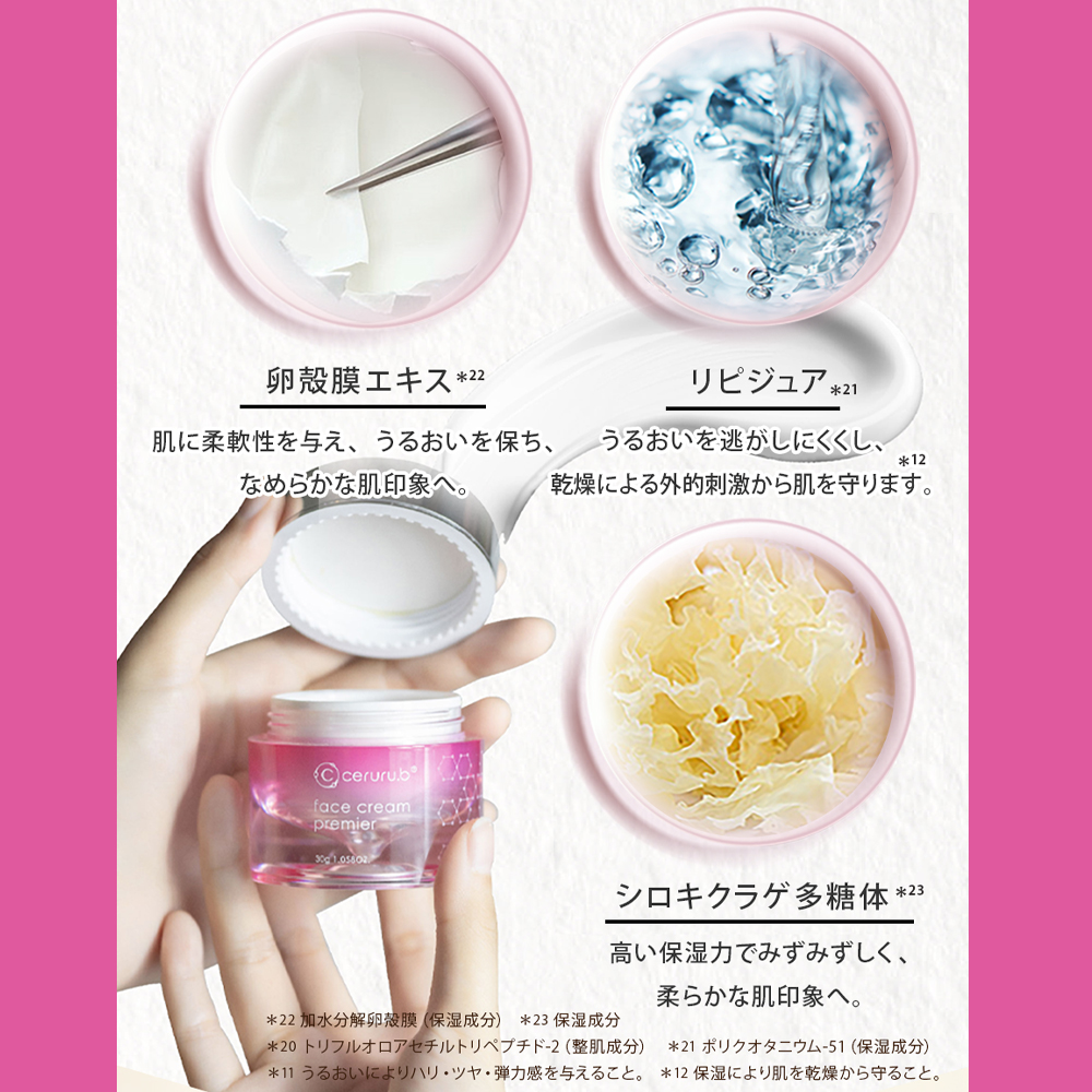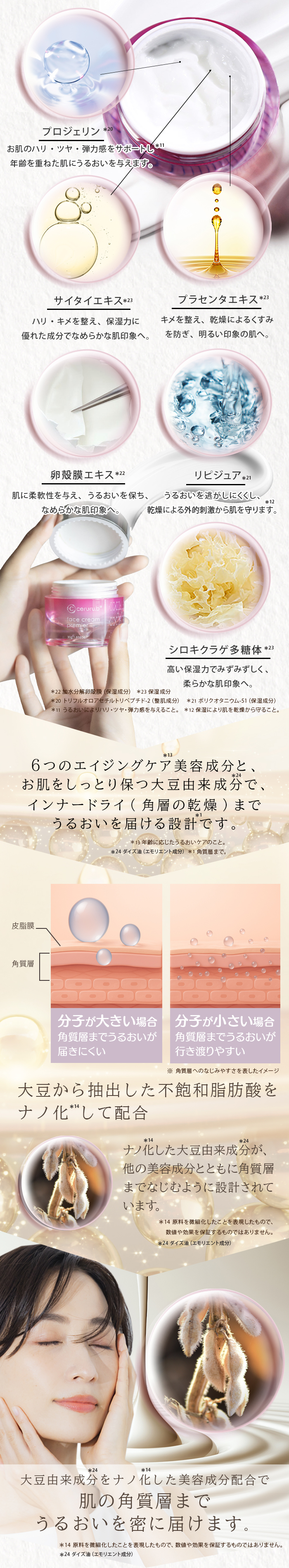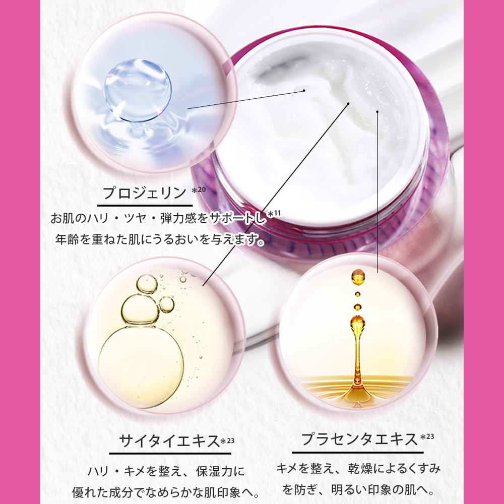 年齢に応じたスキンケアの視点から、『リピジュア※5』『サイタイエキス※6』『卵殻膜エキス※6』『プロジェリン※7』を配合。