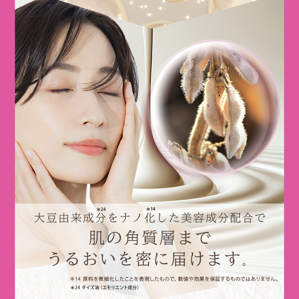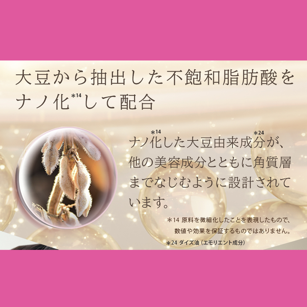 やわらかなテクスチャーで、ヴェールのように肌を包み込む処方設計。 うるおいを閉じ込め、ふっくらとしたツヤ感のある肌印象へ導きます※3 毎日のケアで、なめらかでハリを感じる肌印象をサポートします。 大豆由来成分※4を微細化した設計で配合し、角質層までうるおいを届け、肌をすこやかに保ちます。