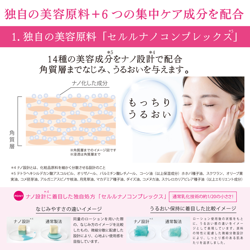 油溶性ビタミンC誘導体※3、安定型ビタミンA誘導体※4、植物由来エキスなど、14種の厳選した美容成分※5を独自技術によりナノカプセル化。うるおいを与え、乾燥による年齢サインが気になる肌をすこやかに整えます※1。