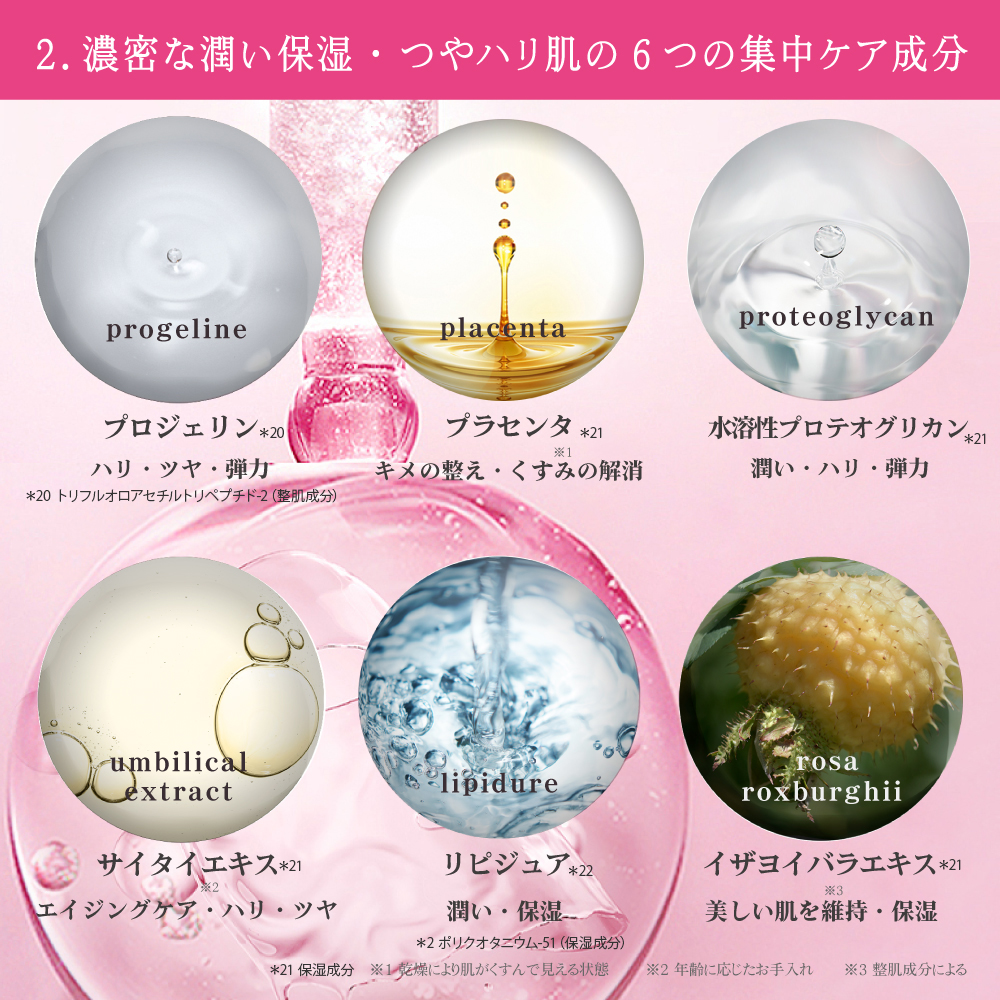『プロジェリン※6』『サイタイエキス※7』『プラセンタエキス※8』『水溶性プロテオグリカン※7』『リピジュア※9』『イザヨイバラエキス※7』などの美容成分を配合。