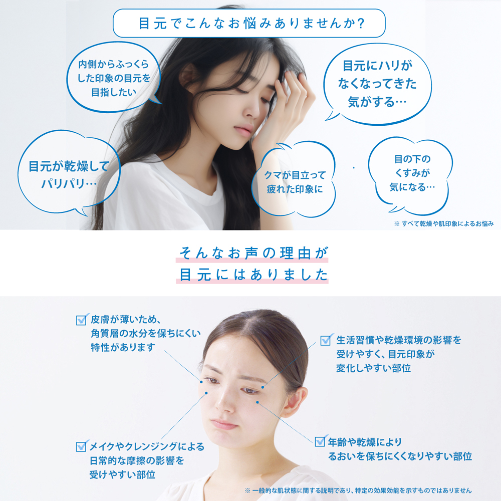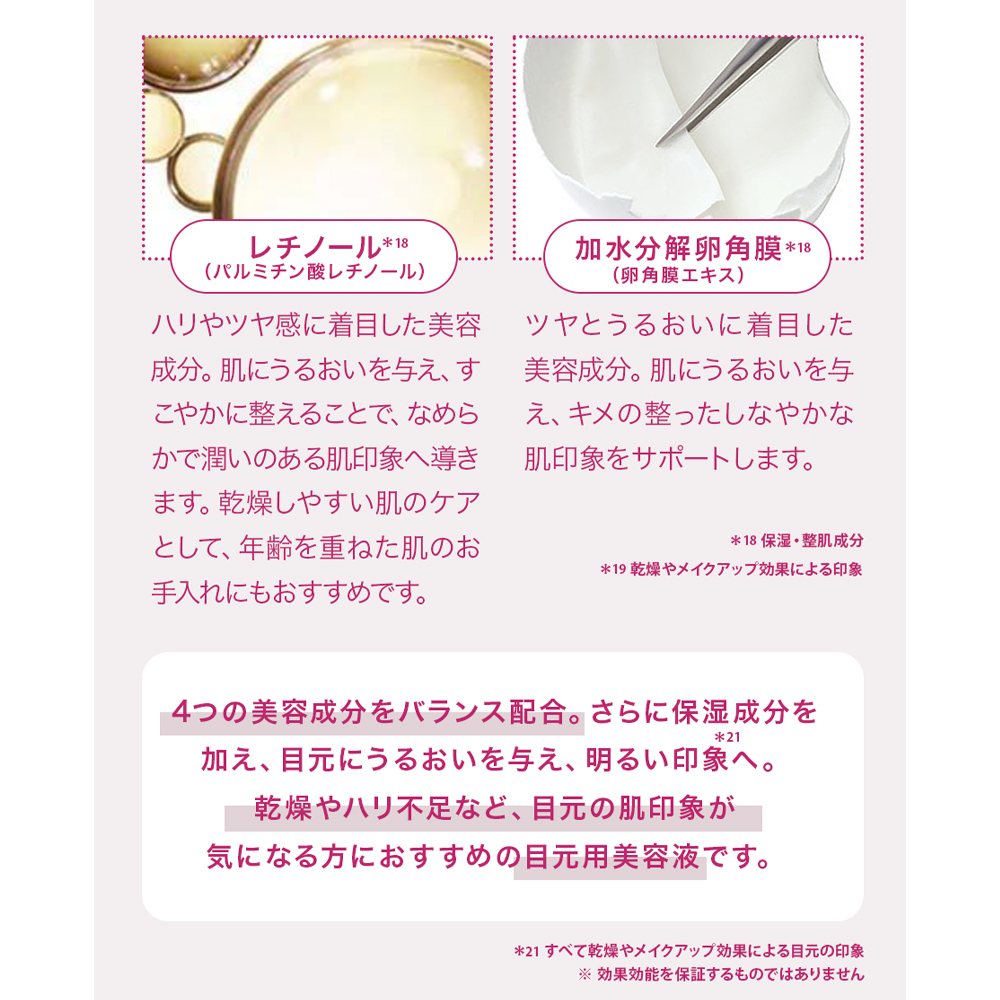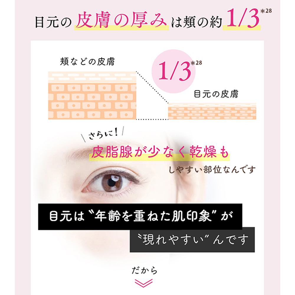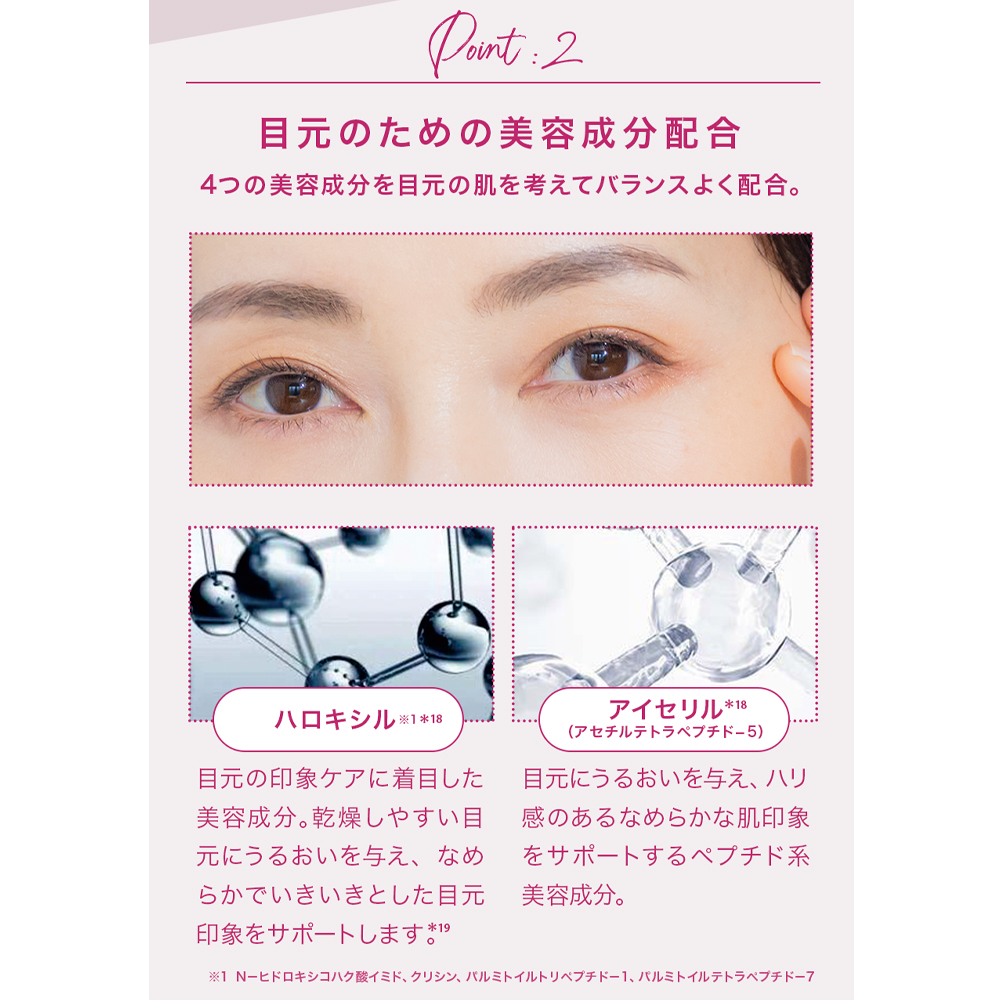 | 肌アプローチ | 乾燥しやすい目元にうるおいを与え、ハリ不足などによる目元の肌印象を整え、すこやかな目元印象へ整えます |