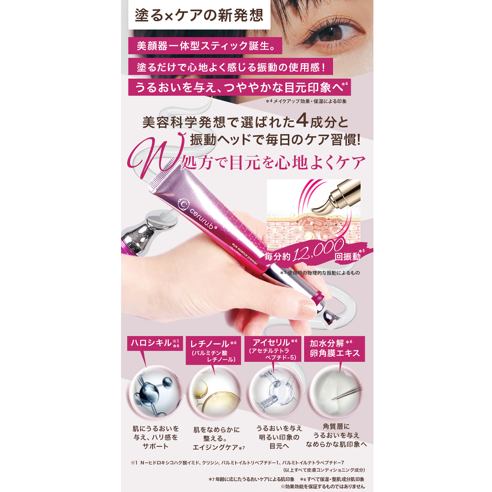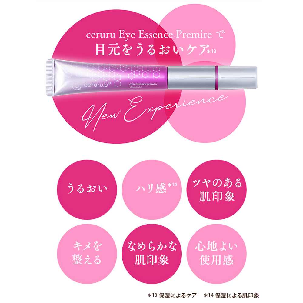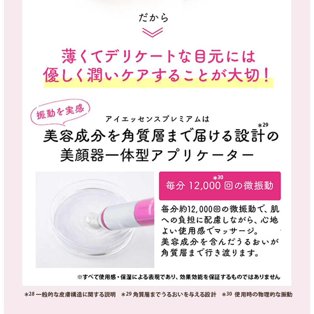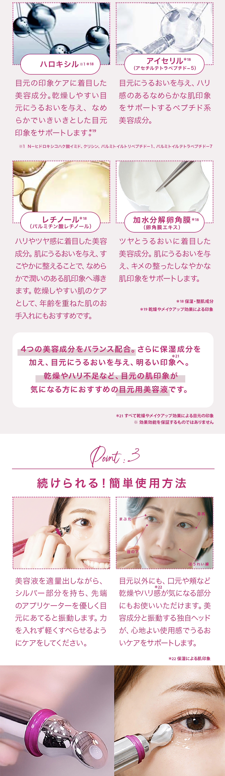 | 肌アプローチ | 乾燥しやすい目元にうるおいを与え、ハリ不足などによる目元の肌印象を整え、すこやかな目元印象へ整えます |