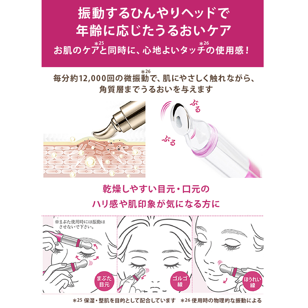 ※10 振動は使用感を示すものであり、浸透促進、血液循環の促進、皮膚状態の変化などの効果を保証するものではありません。化粧品は角質層までの作用に限られます。 -