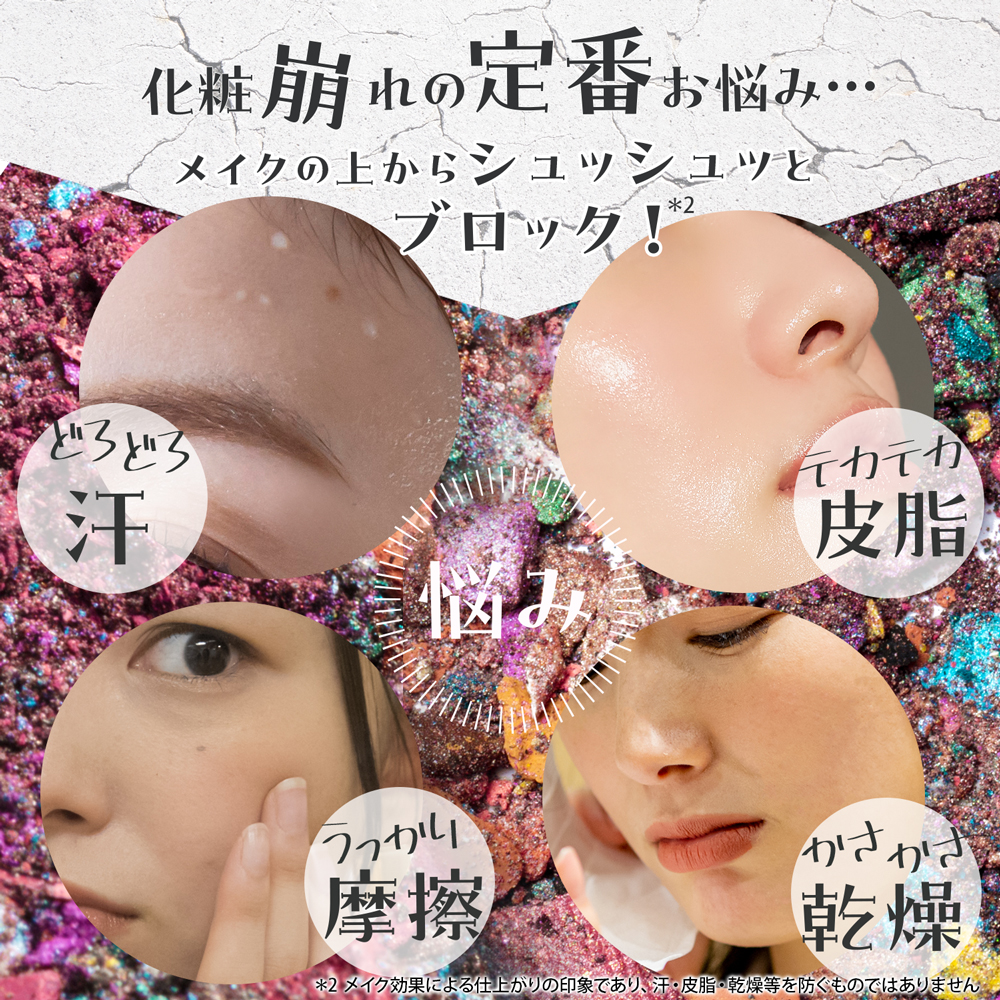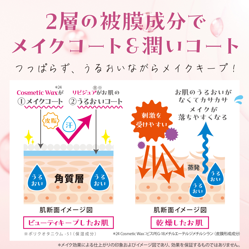 メイクを覆う皮膜を形成し、仕上がりを守ります。 2層(メイクコート&うるおい)の皮膜設計により、メイク崩れと乾燥の両面に配慮しています※3。