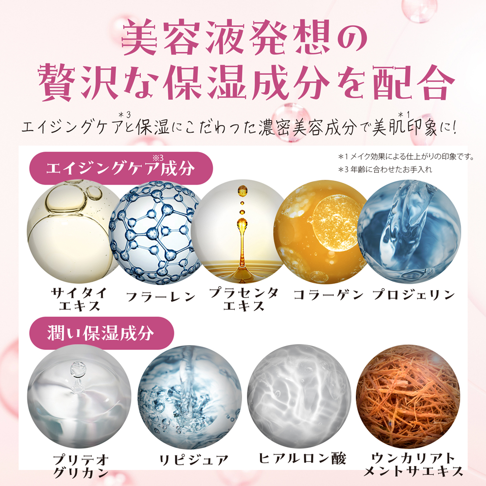 メイクコート成分がメイクを固定しながら、こだわりの美容成分が肌をうるおします。 時間が経ってもヨレにくく、美しい仕上がり印象をキープ。 皮脂や汗によるメイク崩れに配慮し、洋服やマスクへのメイク移りを防ぐ設計です※3。