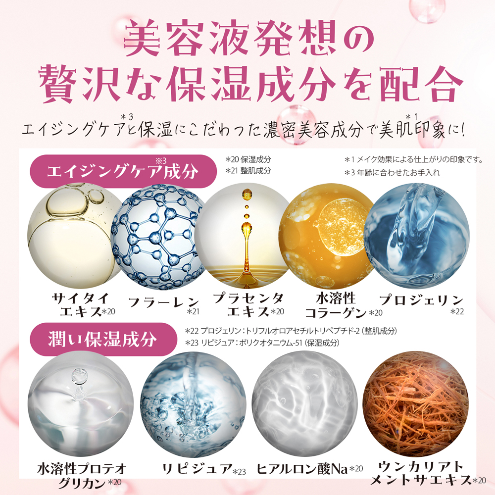 美容液発想で設計された保湿成分を配合し、肌のうるおいを保ちながらメイク仕上がりをサポートします。