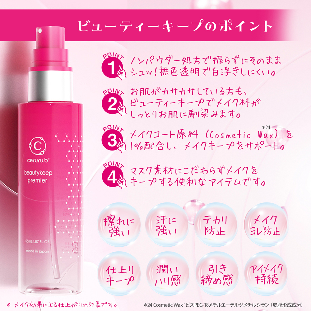 メイク後にシュッとひと吹きするだけで、メイクしたての仕上がり印象を長時間保ちます。メイク後の肌を包み込むように整える、仕上げ用の美容ローションミスト。 メイクの仕上がりを守りながら、肌へのうるおいケアも考えた処方設計です。